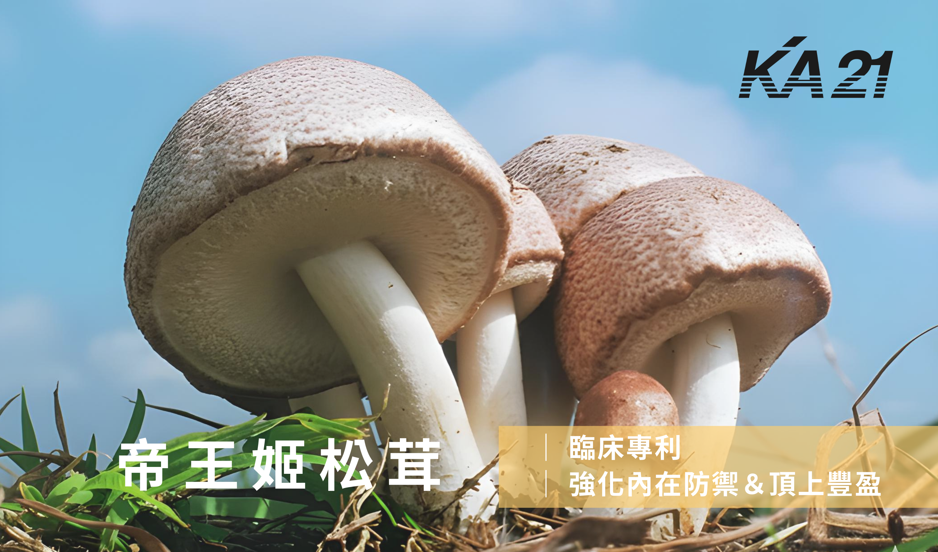 來自豔陽淬鍊下的「帝王姬松茸KA21」又可稱為「巴西蘑菇KA21」,展現了露天栽培的強韌生命力,蘊含超越靈芝 5 倍的抗氧化活性與高濃度維生素 D。它不僅能有效緩解現代生活帶來的疲勞與壓力,陪伴您度過體力下滑、狀態不穩的過渡期,更透過 IGF-1 生長因子機制,同步守護您的內在防禦力與頂上豐盈感。